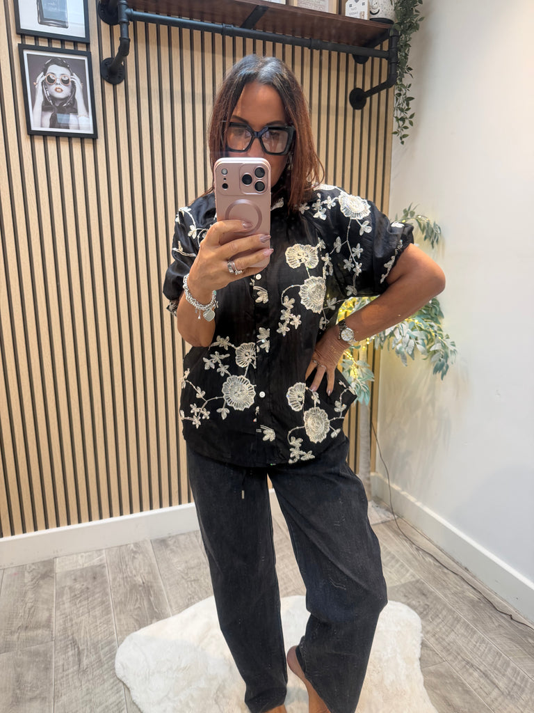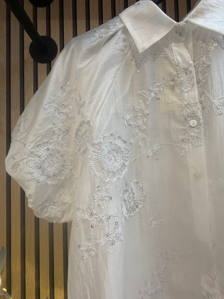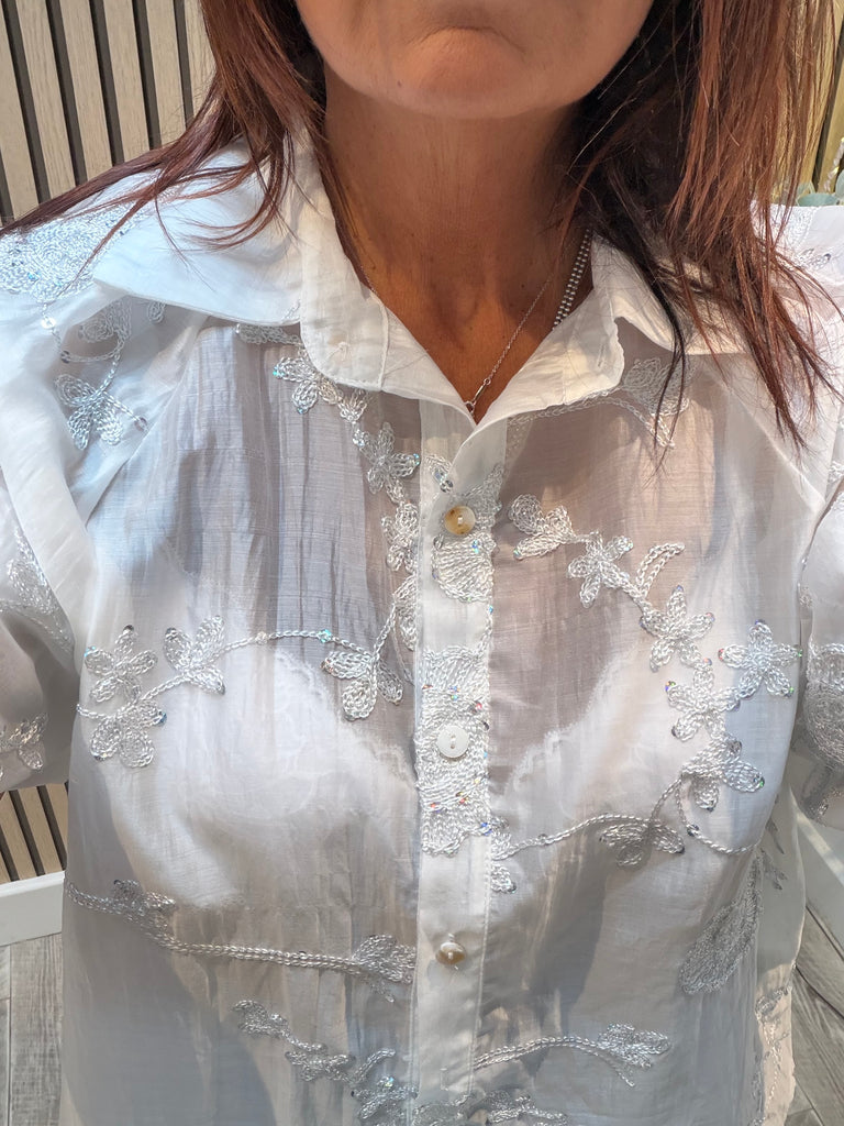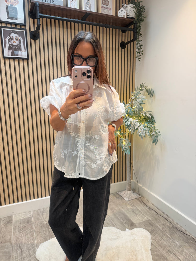 Embroidered Silky sheer Puff sleeve blouse