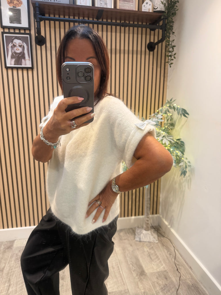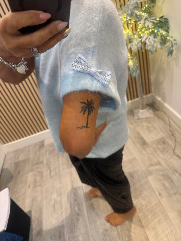 - Short sleeves with diamante bow detail